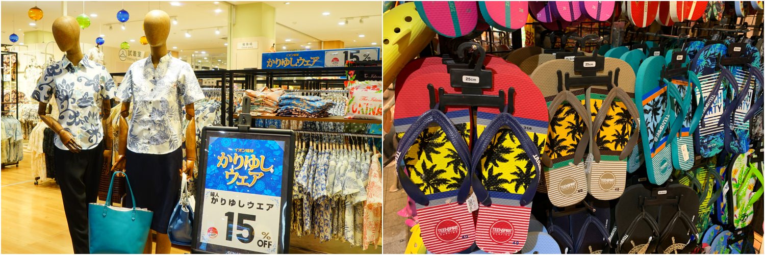 很多人喜歡在沖繩旅遊時買些有沖繩特色的衣服來穿,在地人很愛這種花襯衫,還有樣式花俏的T恤,再搭配一雙彩色夾腳拖,讓你一秒變成沖繩人。國際通很多商店都有賣,但如果沒有急著買,蠻推薦大家到AEON永旺夢樂城沖繩來客夢再入手,除了比國際通便宜,還能使用95折優惠券呢 😆
