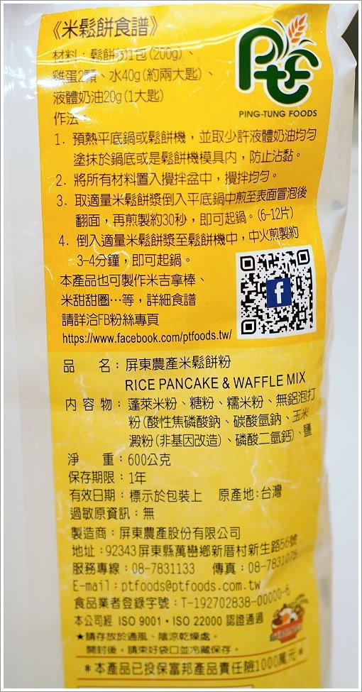 ▼背面除了有內容物、製造商資訊、保存期限等資訊之外,還有提供米鬆餅食譜,讓你在家也能簡單做鬆餅!