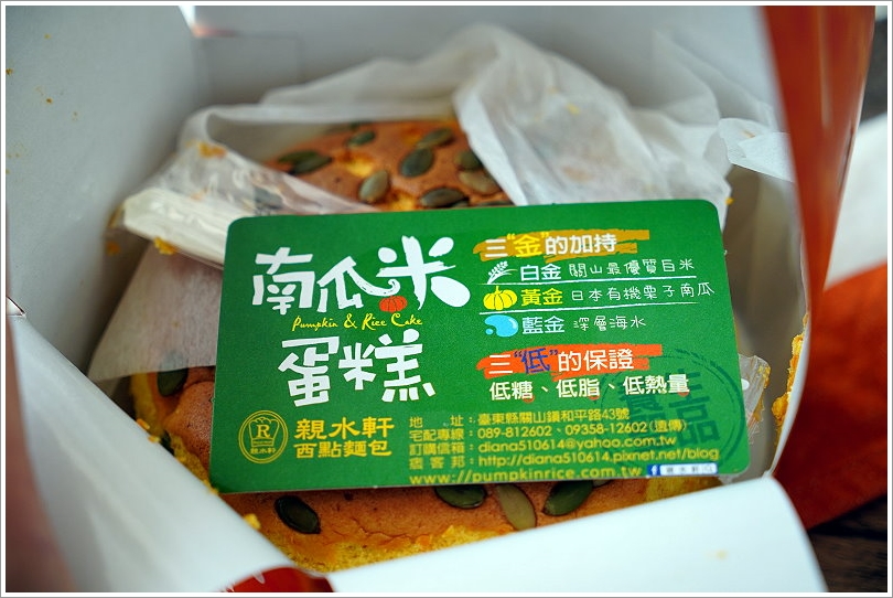 ▼這款南瓜米蛋糕是採用臺東在地生產的有機栗子南瓜、高品質的關山米、及海洋深層水製成,不僅可以看出店家的用心,也能吃得安心又健康!