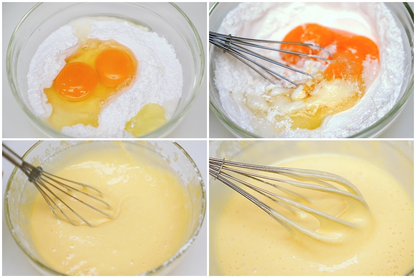 ▼首先先將所有的食材倒入攪拌盆,攪拌均勻備用;另外可以先在平底鍋塗上一層液體油(或奶油),防止米鬆餅沾黏!