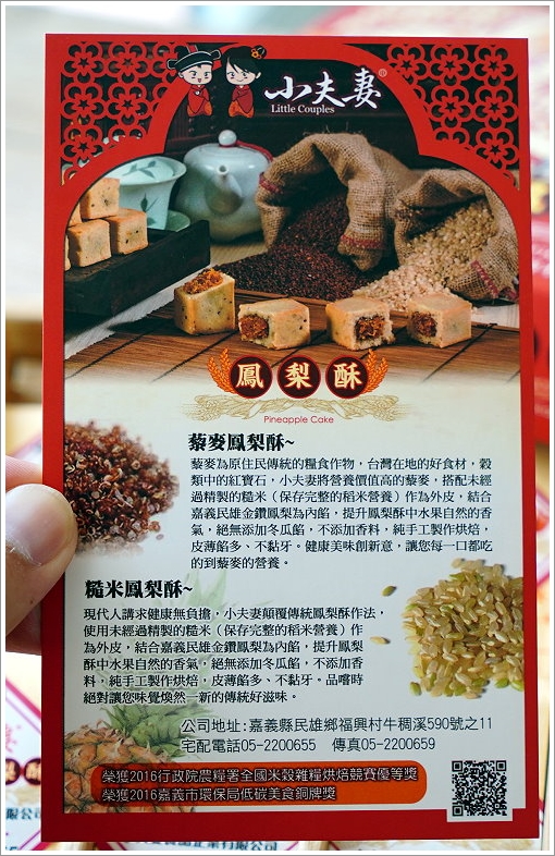 ▼「小夫妻糙米鳳梨酥」曾經榮獲行政院農委會農糧署全國米穀雜糧烘焙競賽優等、嘉義市低碳美食銅牌等殊榮,不僅外盒包裝精美喜氣,而且裡頭的鳳梨酥更是用心製作,讓人吃起來更加健康無負擔!