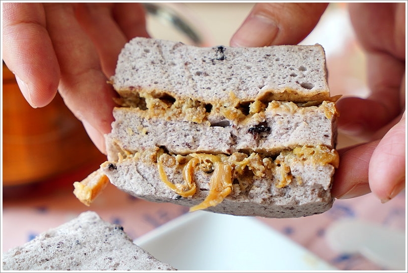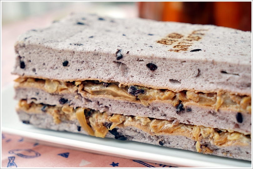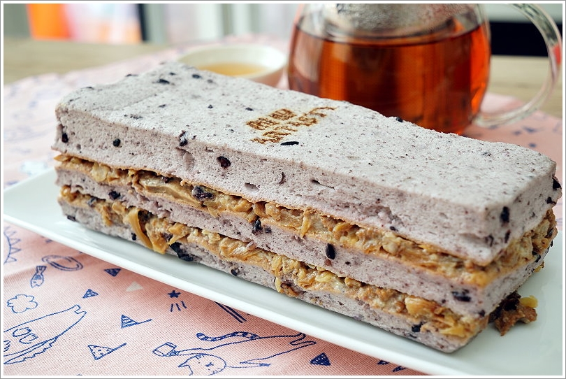 ▼先來看這款「紫米鹹蛋糕」吧!採用蓬萊米穀粉搭配紫米下去烘焙成蛋糕體,再將香菇、脆筍、黑豬肉等拌炒出香氣夾入蛋糕中,不僅是款無添加麩質、100%純米製成的蛋糕, 加上紫米含有花青素,營養豐富,適合全家大小,以及有麩質過敏症的朋友享用!