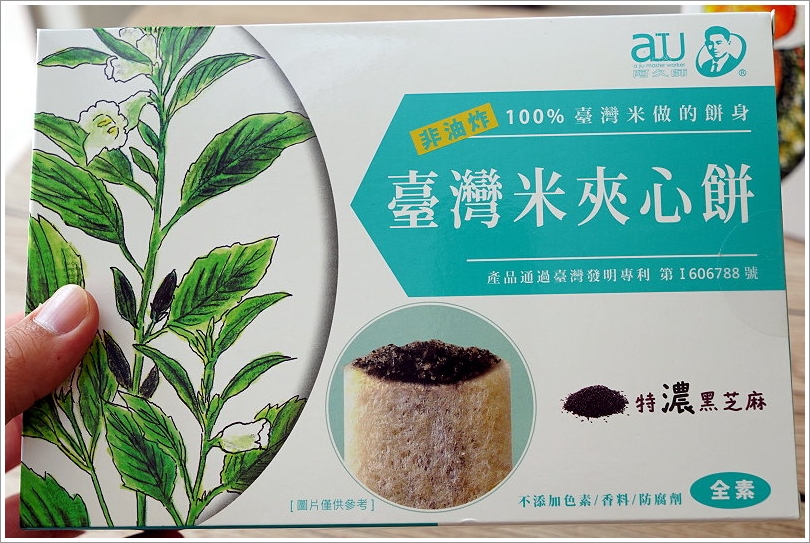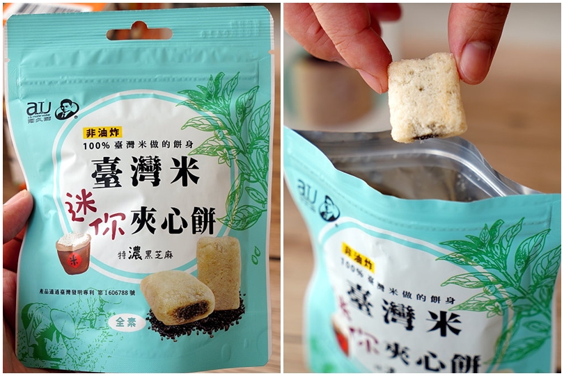 ▼這款「臺灣米夾心餅」特別通過臺灣發明專利,不僅採用100%臺灣米做的餅身,搭配濃郁的黑芝麻更增添不少香氣!