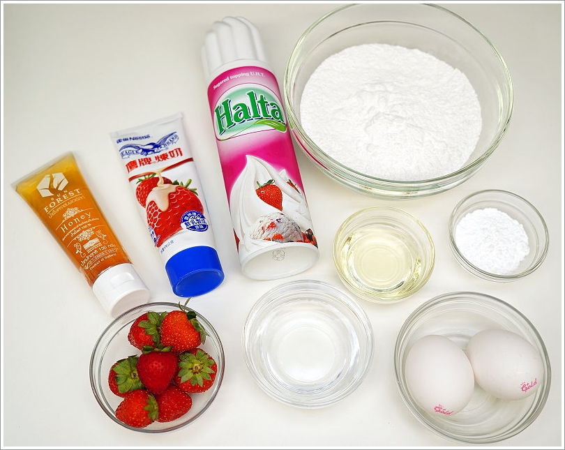 ▼我們依照附贈的食譜來製作,除了準備鬆餅粉一包(200g)、雞蛋2顆、水40g、液體油20g之外,我們另外又準備了草莓、糖粉(裝飾用)、鮮奶油、煉乳、蜂蜜等,就可以簡單來製作一個厲害的草莓米鬆餅唷!
