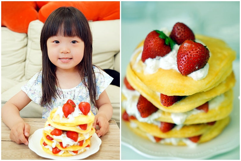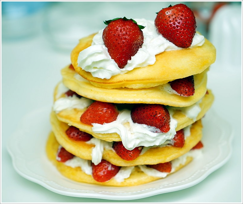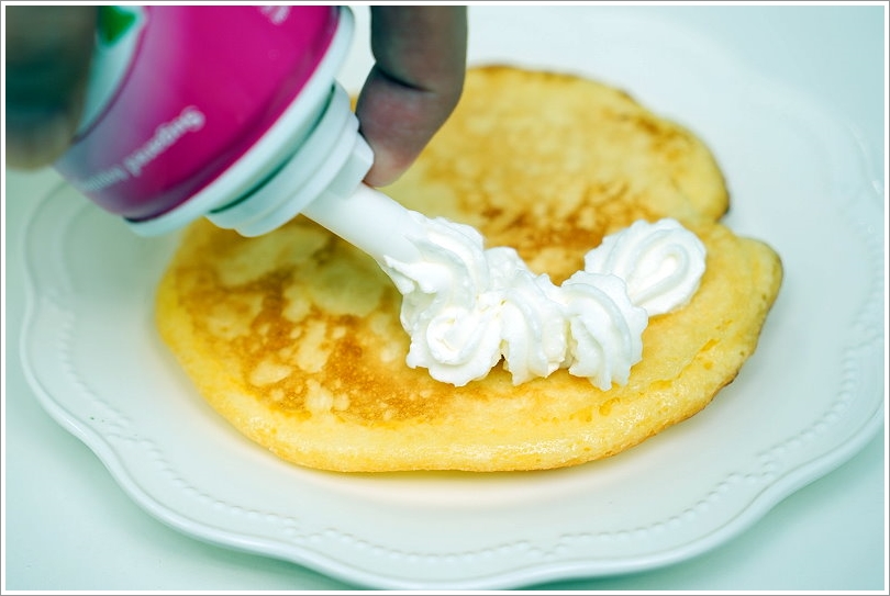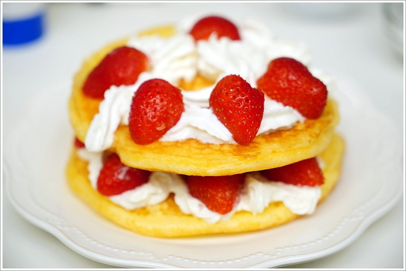 ▼首先先煎好幾片米鬆餅備用,中間每一層都可以擠上一些鮮奶油來裝飾!