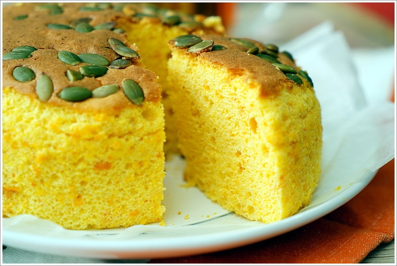 ▼打開一看,裡頭是個8吋的南瓜米蛋糕,看起來黃澄澄的模樣,搭配上頭的南瓜子,感覺相當可口誘人!