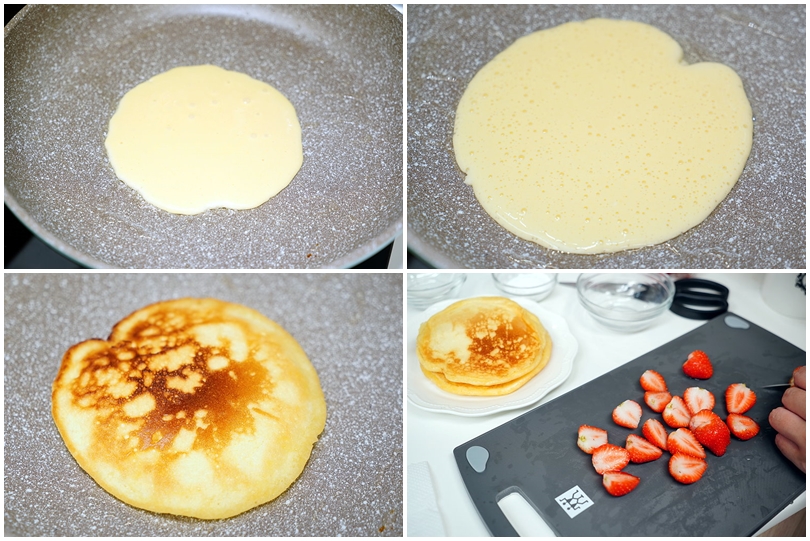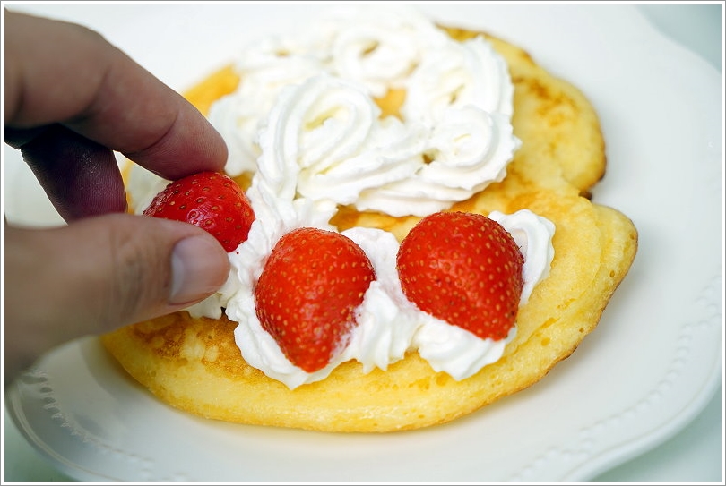 ▼因為我們沒有鬆餅機,所以簡單採用平底鍋來製作;接著就是倒上一大匙的麵糊到平底鍋裡,煎到表面冒泡後即可翻面,再等個30秒即可起鍋!等待米鬆餅起鍋的同時還可以來準備草莓,清洗乾淨後簡單對半切即可,記得要留幾顆完整的草莓放上頭裝飾!