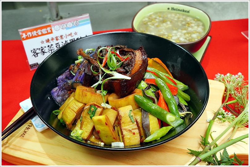 ▼這道來自士東市場曉平家常小吃的「客家菜豆滷黑豬肉」也是大口很喜愛的一道,他們特別採用擁有產銷履歷的食材製作,讓人吃起來安心又美味;另外還採用溫體黑豬肉搭配曬乾的長豆一起燉煮,滷豬腳時還採用花雕酒來調味,真是太厚工啦!一旁搭配的是季節時蔬,吃起來不僅軟Q彈牙,鹹甜入味,搭配時令蔬果更是超合拍,整體吃起來非常棒;後來也獲得評審團一致好評,得到今年的評審團大獎,真的是實至名歸啊(拍手)!