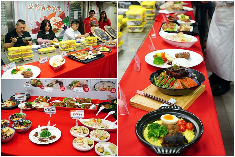 ▼隨著料理時間漸漸到了尾聲,也就是試吃時間啦!依照每位攤商完成時間的不同來決定試吃的順序,除了完成品的擺盤陳列之外,攤商也會另外準備一模一樣的餐盒來讓評審團進行試吃,同時還會一邊聽著攤商介紹他們自家的手作便當特色,讓我們除了視覺、嗅覺、味蕾享受之外,還能進一步了解其中的用心與特別之處!大家可以看到每位評審桌上都疊著高高的便當盒,雖然很飽足但也很滿足啊(開心)~