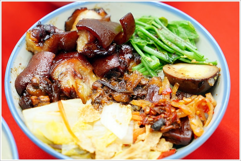▼來自西湖市場小肚子蹄膀豬腳專賣店的「豬腳便當」也是相當厲害,採用每日新鮮現宰豬肉,搭配秘製的陳年老滷,不管是腿庫、蹄膀都上了一層油亮的深褐色,吃起來軟Q又帶有討喜的甜味,唇齒一抿還有濃郁的膠質口感,一整個相當下飯;一旁搭配各式配菜、滷蛋跟特製辣蘿蔔絲,辣得過癮又夠勁,搭配白飯也非常棒!