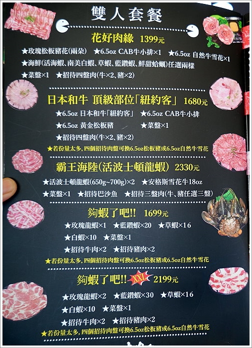 ▼沒多久,花好肉緣雙人套餐上桌啦!裡頭有玫瑰松阪豬花x2、6.5oz CAB牛小排x1、6.5oz自然牛雪花x1、海鮮(活海蝦、草蝦、藍鑽蝦、鮮甜蛤蜊任選兩樣)、菜盤x1、招待四盤肉(牛x2、豬x2),整個桌子瞬間被擺滿,一開始就這樣嚇我們好嗎?!哈哈~
