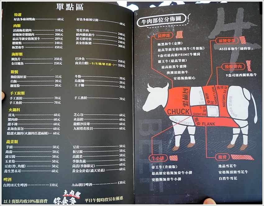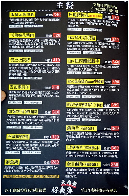 ▼詳細菜單,第一頁有提供TOP 10的銷售排行,很適合第一次來或是跟我們一樣有選擇困難的朋友!另外也有湯底、雙人套餐、精選套餐、主餐、精品海鮮、大肉盤、單點等,選擇超級多元!最近還有推出極上和牛季,只要560元起就能享用到美味的和牛,真的非常超值!
