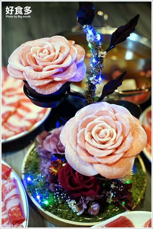 ▼玫瑰花松阪豬得花上好一段時間塑型,費時費工,加上燈飾、乾冰一起出場,根本就是一個充滿仙氣的玫瑰花松坂豬啊!