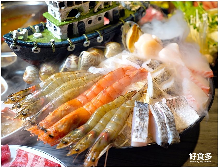 ▼滿載海鮮的船隻引領著陣陣波浪襲來,裡頭有干貝、鮑魚、軟絲、天使紅蝦x2、南美白蝦x7、鯛魚片、鱸魚片、蛤蜊等好料,讓喜愛海鮮的朋友也可以吃好吃滿!