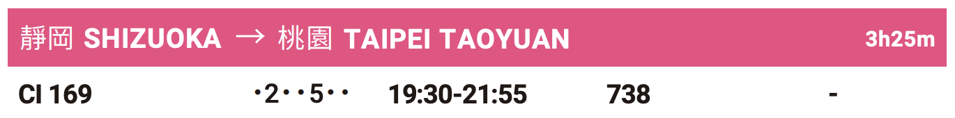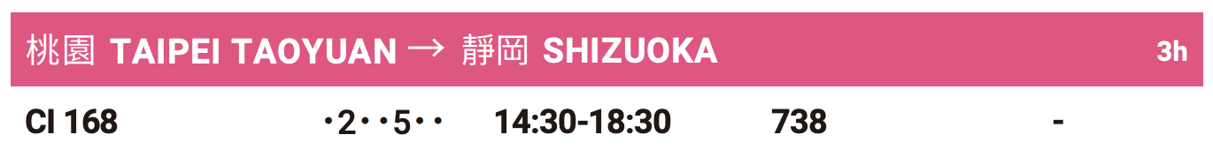 靜岡其實有一個富士山靜岡機場 (FSZ),有直飛!!!而且只有華航有,你可能會查到日航,但實際上是華航營運唷!一週只有兩天有直飛,來回各一趟,飛行時間去程3小時,回程3小時25分。