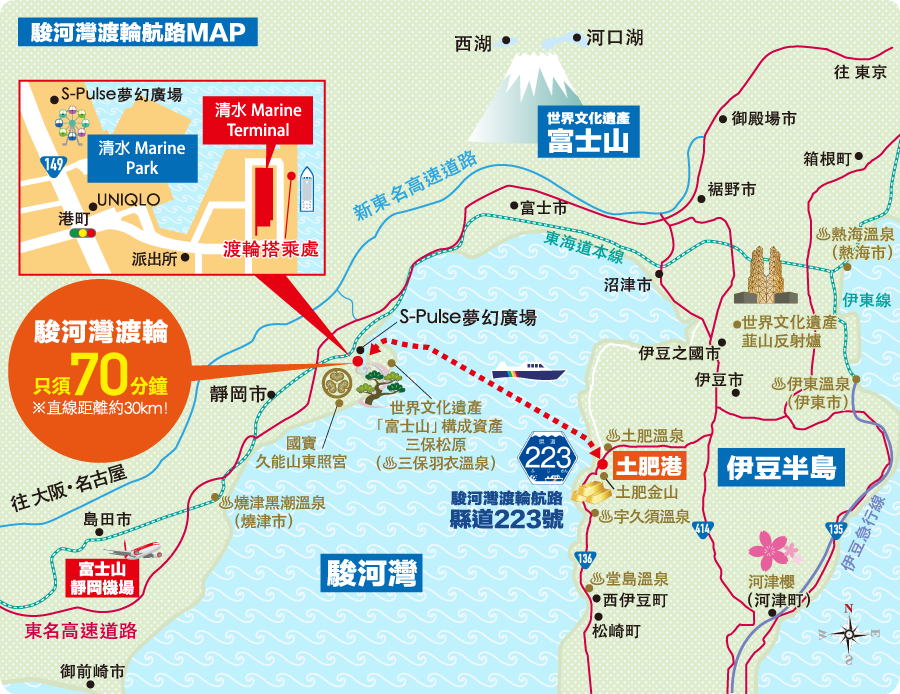 從土肥港到清水港,如果是搭路上交通工具最快也要個三小時,但如果是搭渡輪只要70分鐘,價錢才差600日圓左右。如果是要從伊東玩到伊東要再到靜岡的人不妨可以搭這個渡輪,省時又多一種體驗。