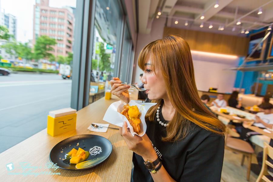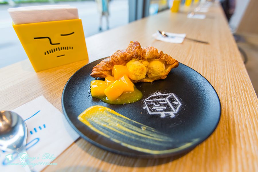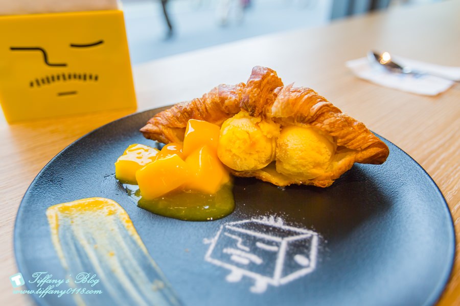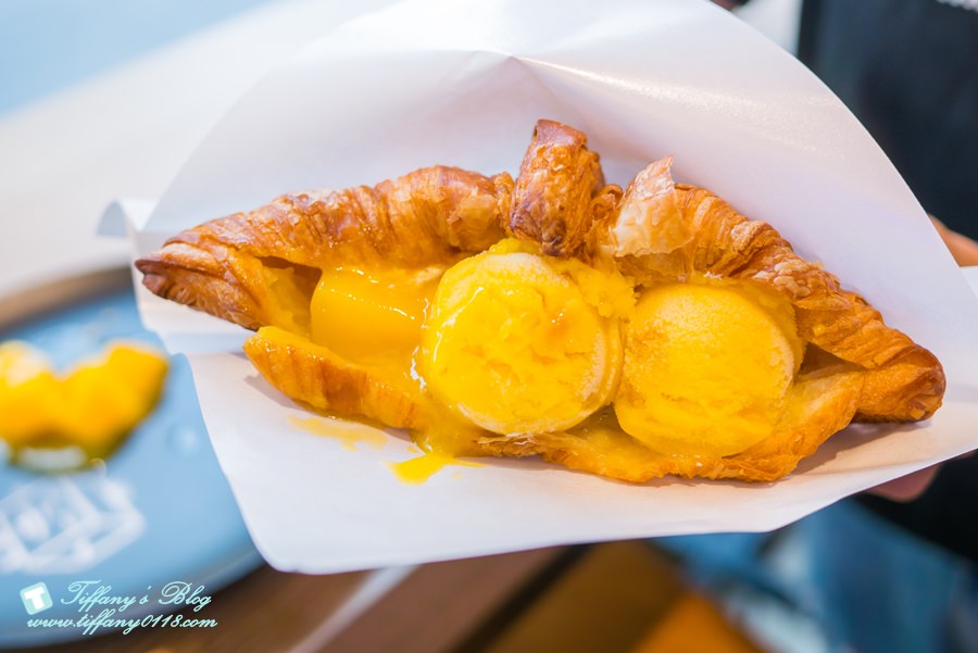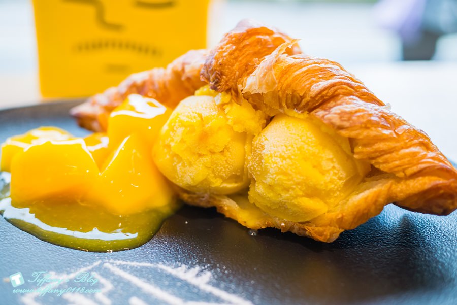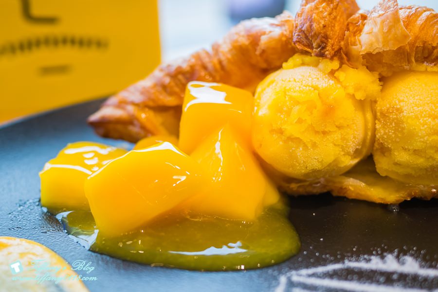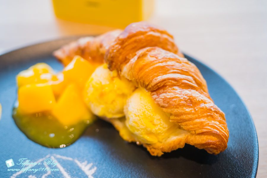 可頌吃起來有點像千層酥的口感,因為是現烤的所以吃起來微熱些酥,搭配芒果雪酪跟新鮮芒果一起吃,滿滿的芒果香甜味在嘴巴裡真的超滿足的。