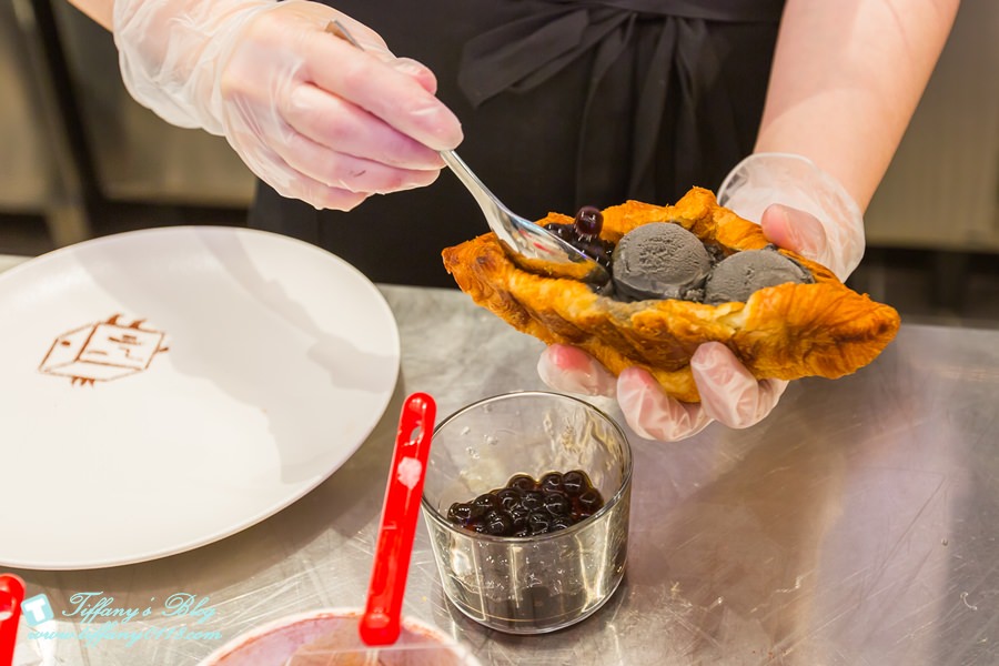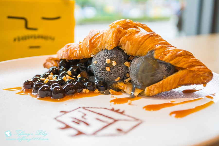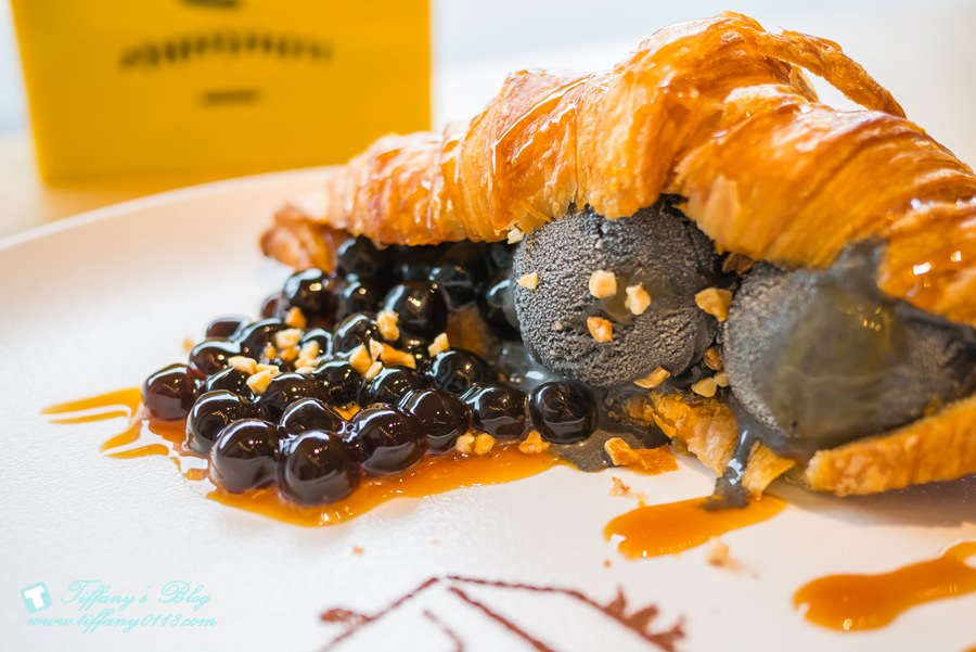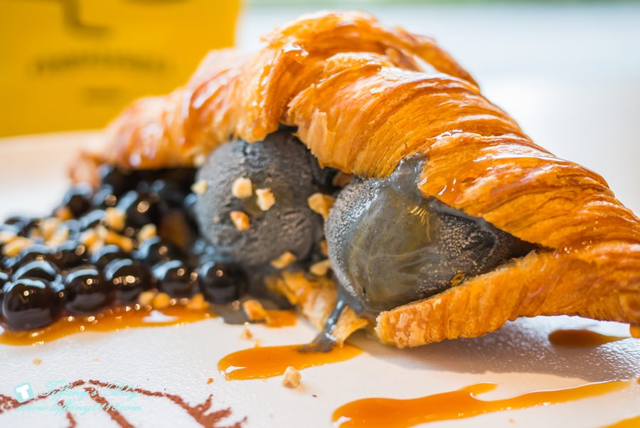 可頌的部分會先烤過,再加入黑芝麻雪酪,還有黑糖珍珠,最後淋上自製焦糖醬就完成了煤礦可頌冰,是不是看起來真的很像開採中的煤礦呢?