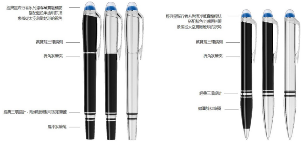 全新星際行者系列呈現了人類最不可思議的強大冒險奧秘:太空探險。書寫工具的高級黑色樹脂令人聯想到黑暗的浩瀚宇宙,萬寶龍標誌下方的半透明圓頂設計呈現從月球眺望地球從月平線升起的畫面,以不同的視角欣賞我們的地球。拋光包鉑筆蓋與筆身象徵太空人,而有稜有角的筆夾與圓頂設計像極了太空火箭的形狀,書寫工具前端筆蓋與筆尾旋轉機制就像是太空人前往太空前,將頭盔固定在太空衣的方式。