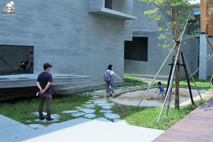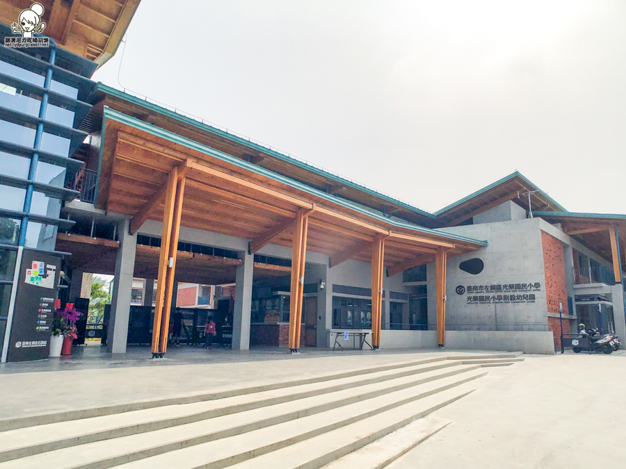 園區大門與光榮國民小學連成一體,使用木製屋頂與清水模搭建,非常有質感帶有溫度