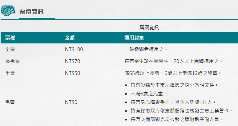 台南左鎮化石園區票價資訊,全票 100元、優惠票70元、半票50元,未滿六歲免費參觀