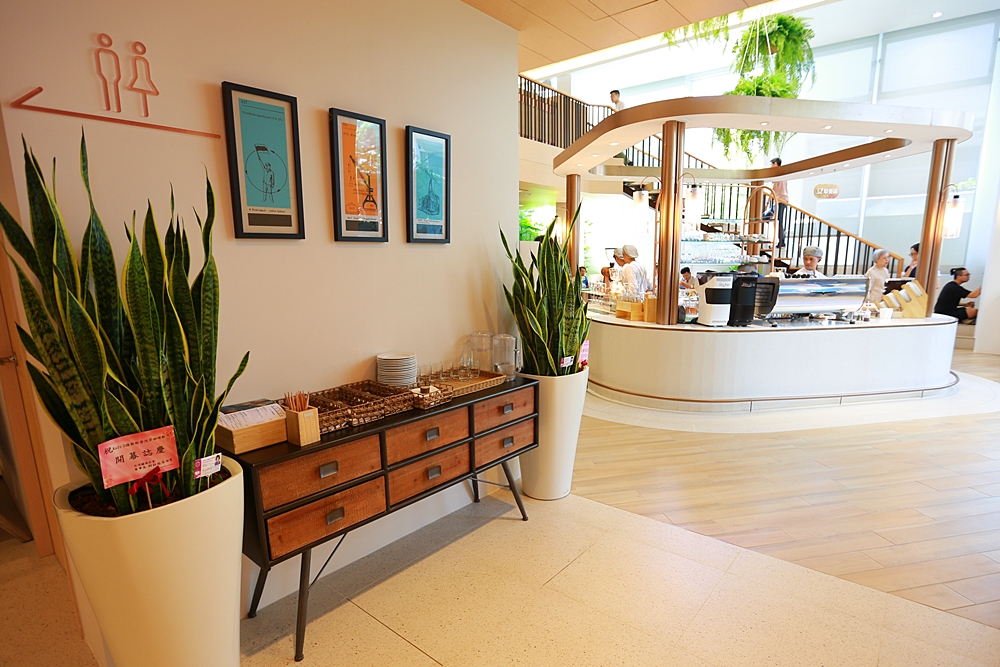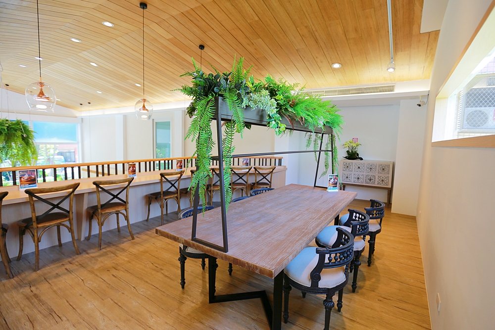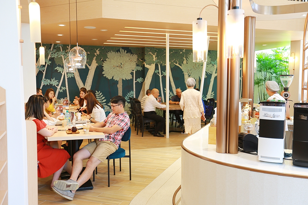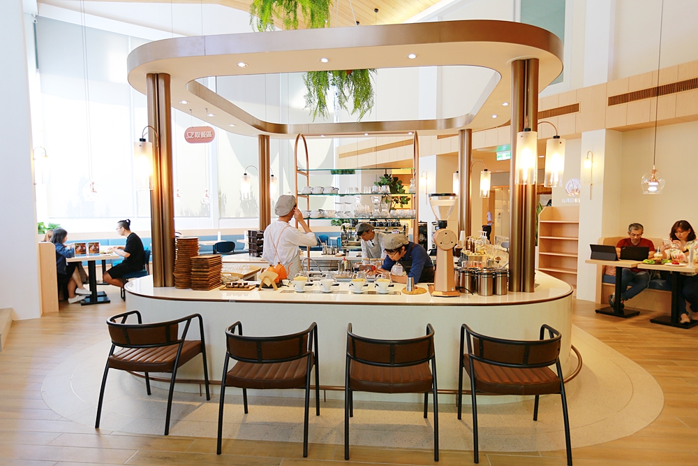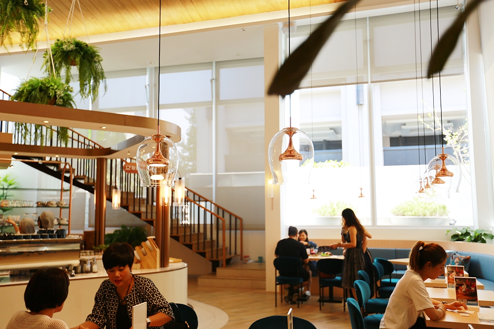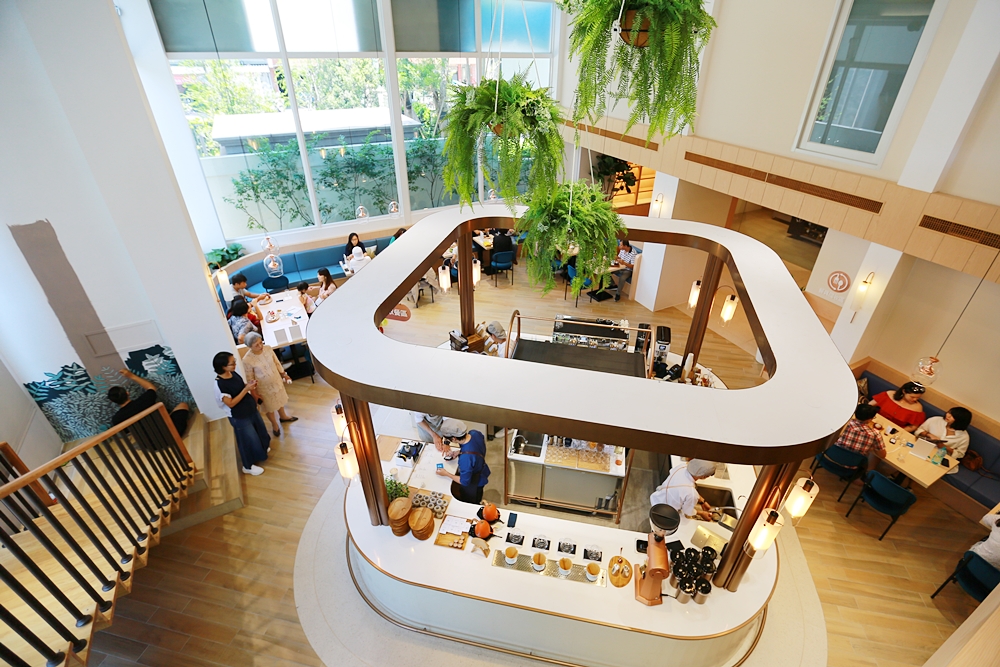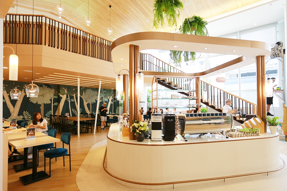 室內空間好寬敞,從門口走進來後先是被玫瑰金充滿質感的挑高吧檯吸引,接著往裡面座位區走又是別有洞天,以木質地板延伸到木質天花板,其中穿梭著綠色盆栽和森林意象壁畫,簡直是在河邊森林的感覺,迎面而來的不只是寬敞風景也是一種無可取代的舒適感,這座可愛的弧形咖啡吧檯展現出店中店的錯覺。