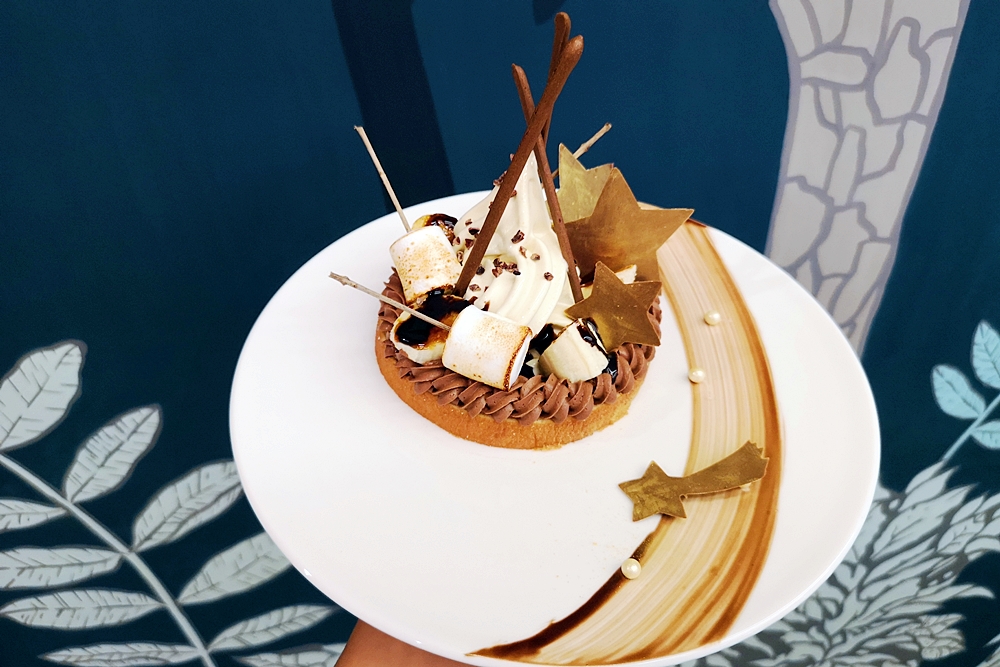 以德國傳統年輪蛋糕為基底的盤式甜點是這裡一大特色,共有兩種口味。咖啡色系的黑森林之夜是黑可可奶油配上烘烤棉花糖,甜味中散發甘苦,中間是冰淇淋,基底蛋糕是用年輪蛋糕做成,口感層次豐富,沒想到年輪蛋糕也能做出美輪美奐的組合。