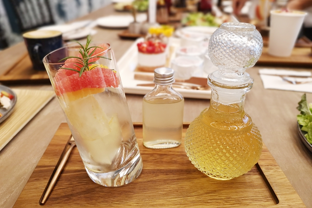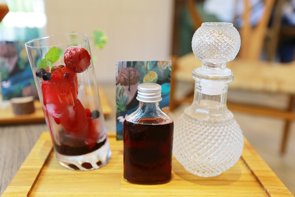 連個氣泡飲都是網美系擺盤耶!用酸甜莓果做成的冰磚,附上紅醋栗、覆盆子和紫紅色小瓶大補鐵,美麗的香水玻璃瓶裡是氣泡水,喝的時候把大補鐵和氣泡水各半倒入玻璃杯裡,在氣泡不斷上升的杯中享受著酸甜野莓滋味。這個大補鐵是來自德國原裝的鐵劑,作成創意飲品不只講求好喝更喝的健康。