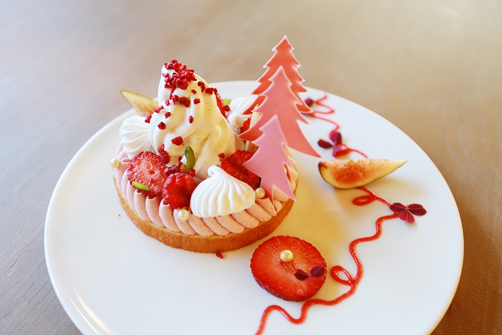 夢幻粉色系深受女孩喜歡的「莓果狩獵者」以酸甜莓果組合,底層是年輪蛋糕基底,上頭用最近國內外討論度極高的紅寶石巧克力 (Ruby Chocolate)製成奶油和可愛造型的粉紅小樹,加上冰淇淋、新鮮莓果組合,吸睛度滿分。Ruby Chocolate除了天然粉紅色澤,也帶有淡淡的天然莓果香,邊吃甜點邊冒著粉紅泡泡了(笑)。