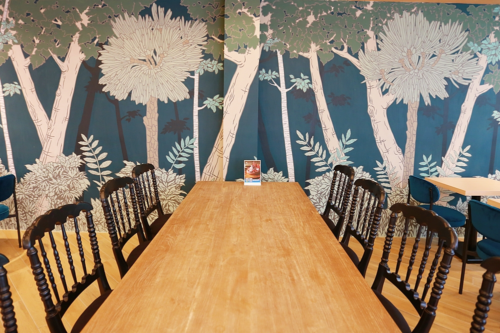 ▲畫功細膩的森林壁畫,讓人有置身森林河岸喝咖啡的感覺。