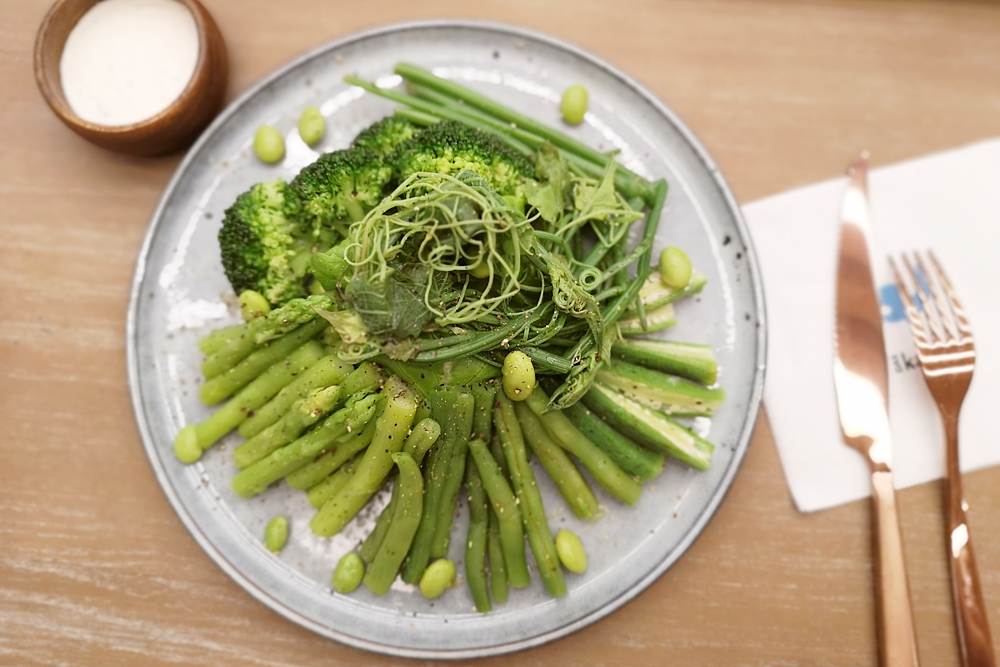 裡面有蘆筍、秋葵、毛豆仁、龍鬚菜、綠花椰、四季豆,簡單撒上現磨胡椒,一旁搭配的是堅果沙拉醬,不管是單吃蔬菜還是配上沙拉醬都很美味,天氣炎熱沒胃口或是想保持身材,這道健康低卡又能吃飽足的綠沙拉最適合。