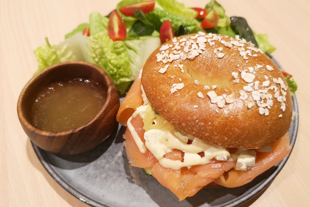 想要吃飽足的話就選這個煙燻鮭魚乳酪貝果吧!中間夾了滿滿燻鮭魚、酸豆、乳酪,抓起來大口咬下去是最豪邁吃法了!貝果要端上桌就趕快吃,麵包口感會比較Q軟,一旁的是油醋醬和新鮮沙拉,整份吃完很滿足。