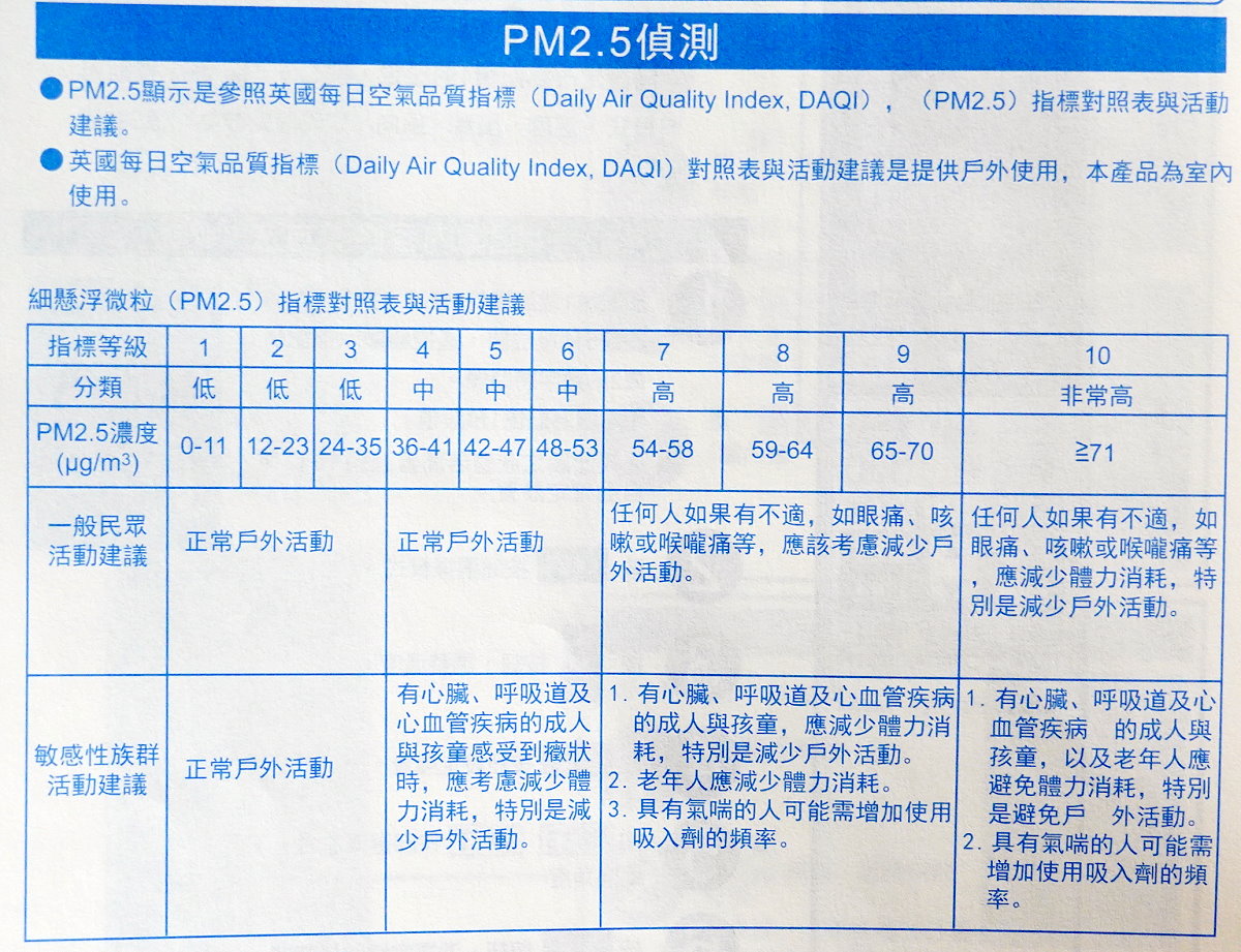 ▼說明書裡頭也有列出詳細的PM2.5偵測濃度表,上頭都有清楚的說明,讓人一目了然,乾淨空氣真的看得見喔!