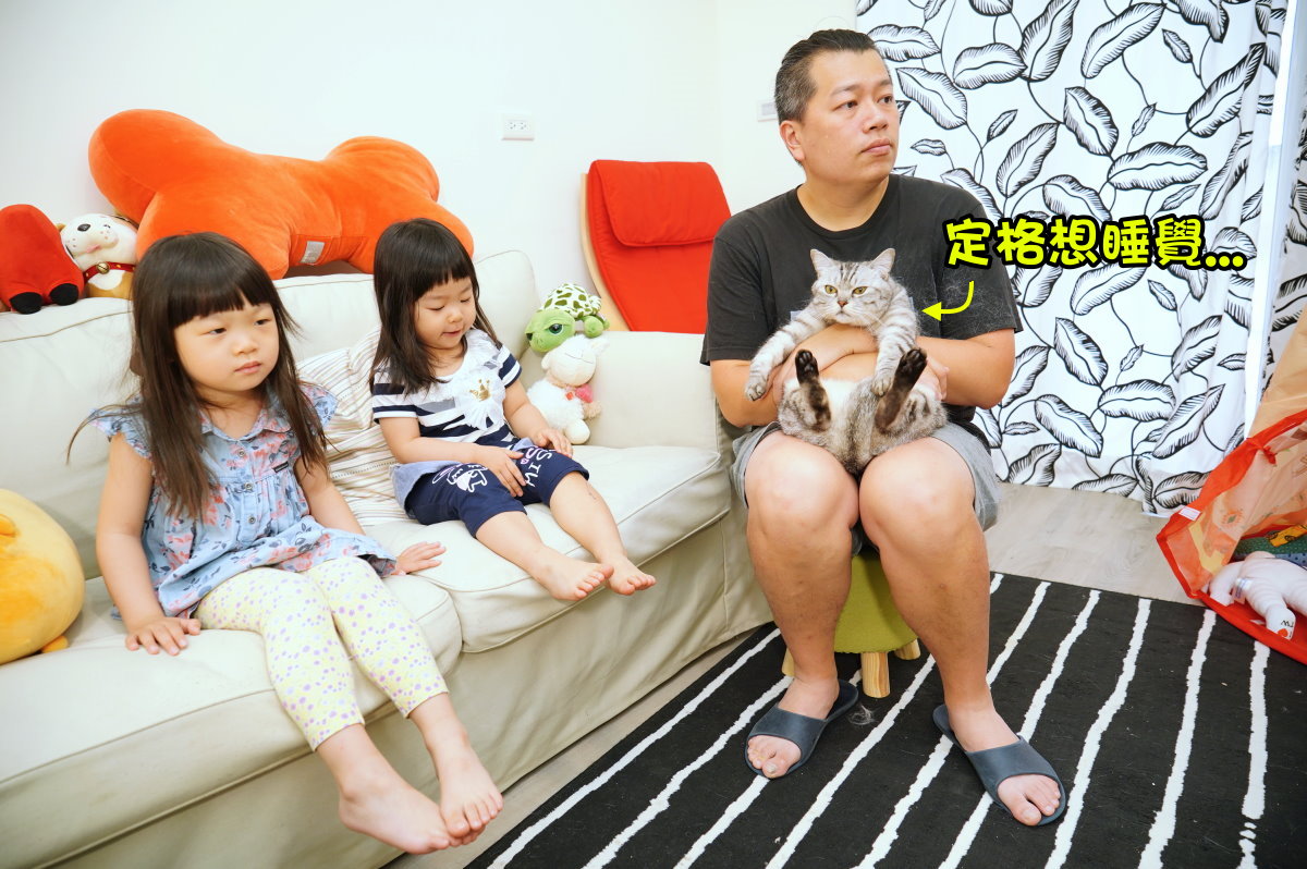 ▼吃飽喝足後,大口帶著四歲多的美國短毛貓上樓來跟小倆口玩耍,阿喵感覺有點愛睏,還是看到太多人突然有點定格不敢動(笑)!