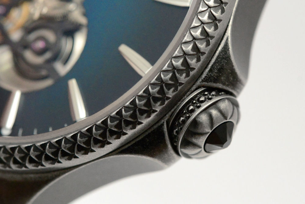 VALIMOR最令人刻像深刻的、莫過於其靈感來自英國亞瑟王傳奇的龍甲錶殼與王冠龍頭,其設計以哥德式藝術中最重要的尖拱元素互相重疊形成,而龍頭更鑲有暗黑施華洛世奇水晶、皇者氣息十足。
