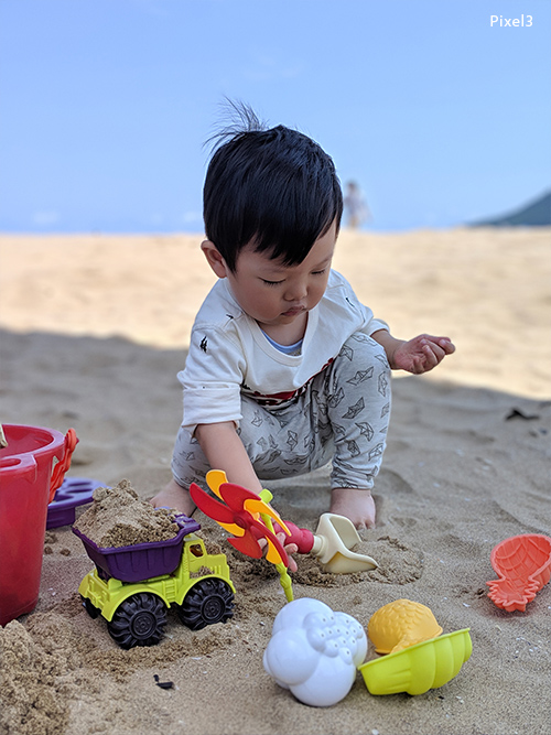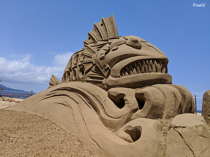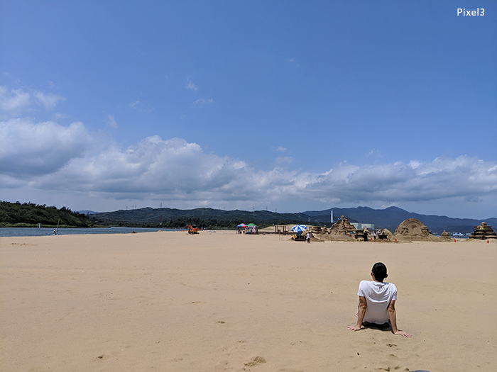 Pixel3 白平衡有些許偏藍,同時對比反差較大,因此整體的調子較硬,同時左下角的沙表現也較不明顯。