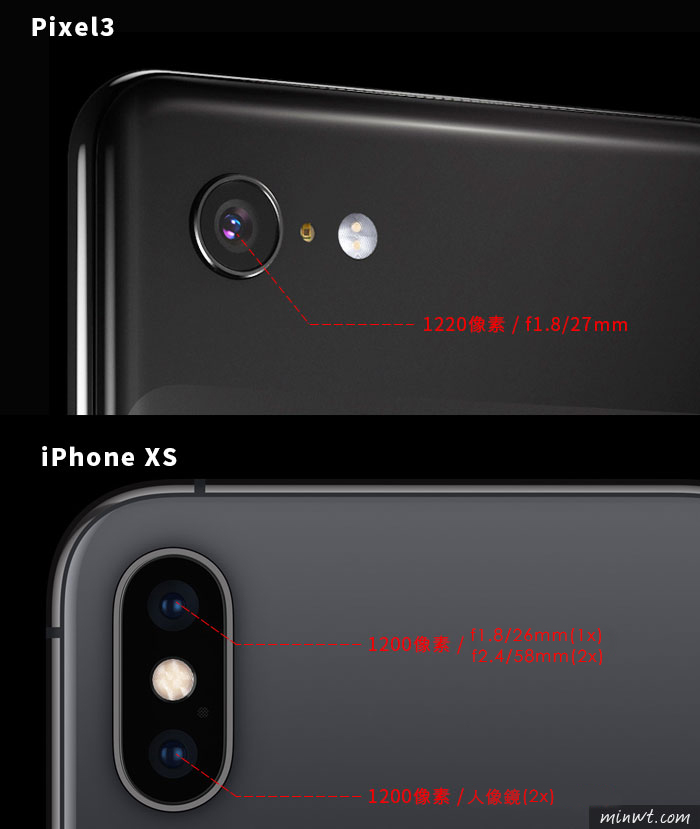 鏡頭的設計上,Pixel3搭載一顆27mm的廣角鏡頭,而iPhone XS則是搭載雙鏡頭,分別為26mm與58mm,同時二隻都是1200萬畫素。