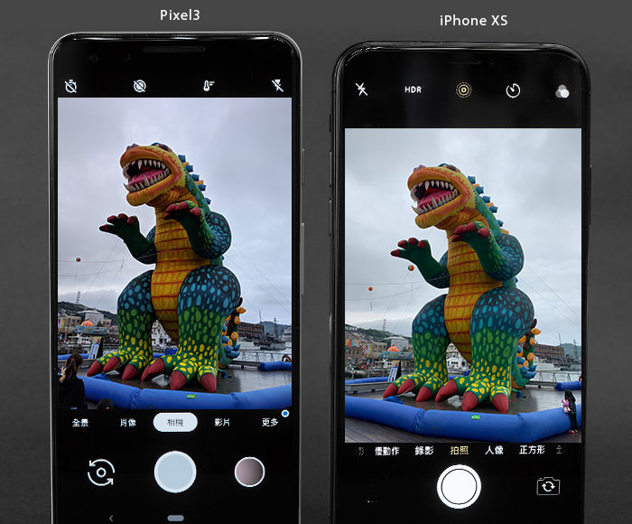 接下來兩隻內建的相機拍照界面,左是Pixel3 右是iPhone XS,可看到操控的部分,極為相似。