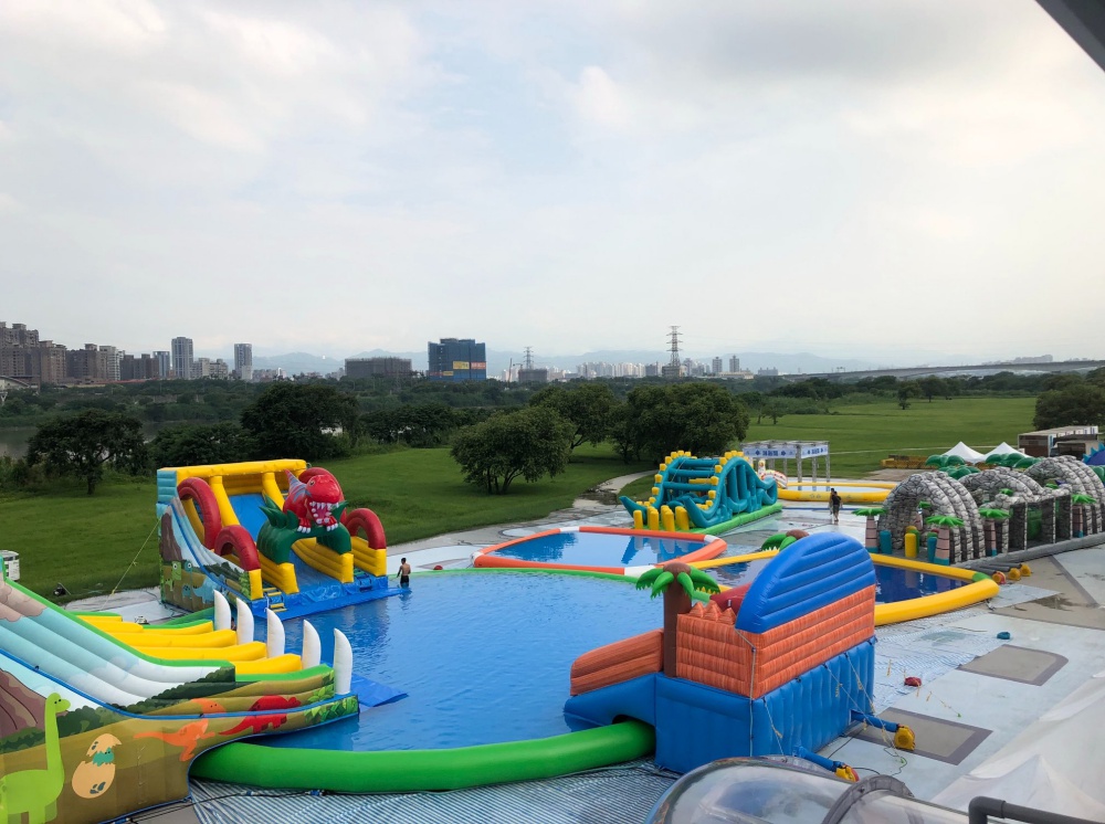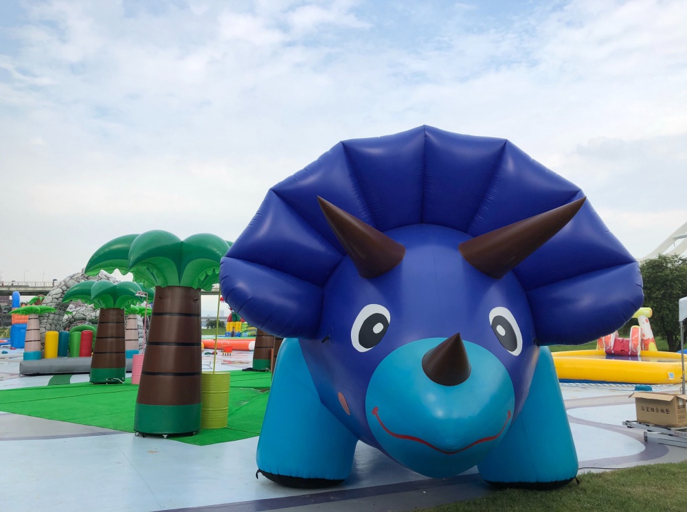 「勇闖恐龍窟」: 暴龍、三角龍、迅猛龍的大型氣墊溜滑梯以及大型玩水池, 讓大朋友小朋友能玩得盡興
