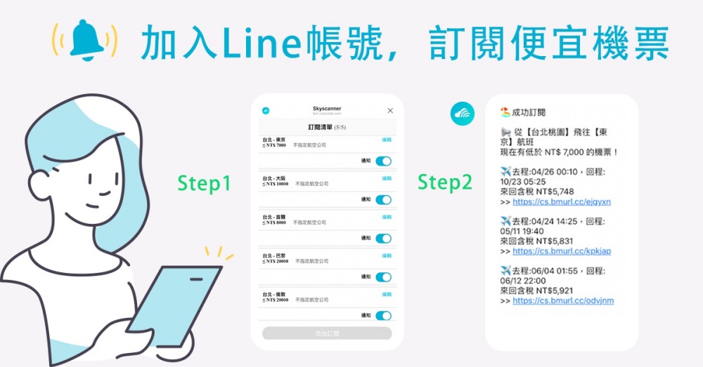 「機票價格」一直都是旅客在規劃旅遊行程時,十分重要的考量項目,因此 Skyscanner 特別在Line官方帳號上同步推出「低價機票訂閱」功能,讓旅客透過 Line 就能夠接收每天的票價資訊。旅客現在只要在Line上搜尋「@skyscanner」並加入官方帳號,除了第一手的優惠票價資訊及每個月不可錯過的抽獎活動之外,旅客也可直接點選「低價機票訂閱」,設定好目的地,並參考「Skyscanner『Good』價指數」,設定好價格範圍後,Skyscanner每天都將替您找出符合需求的旅遊產品。