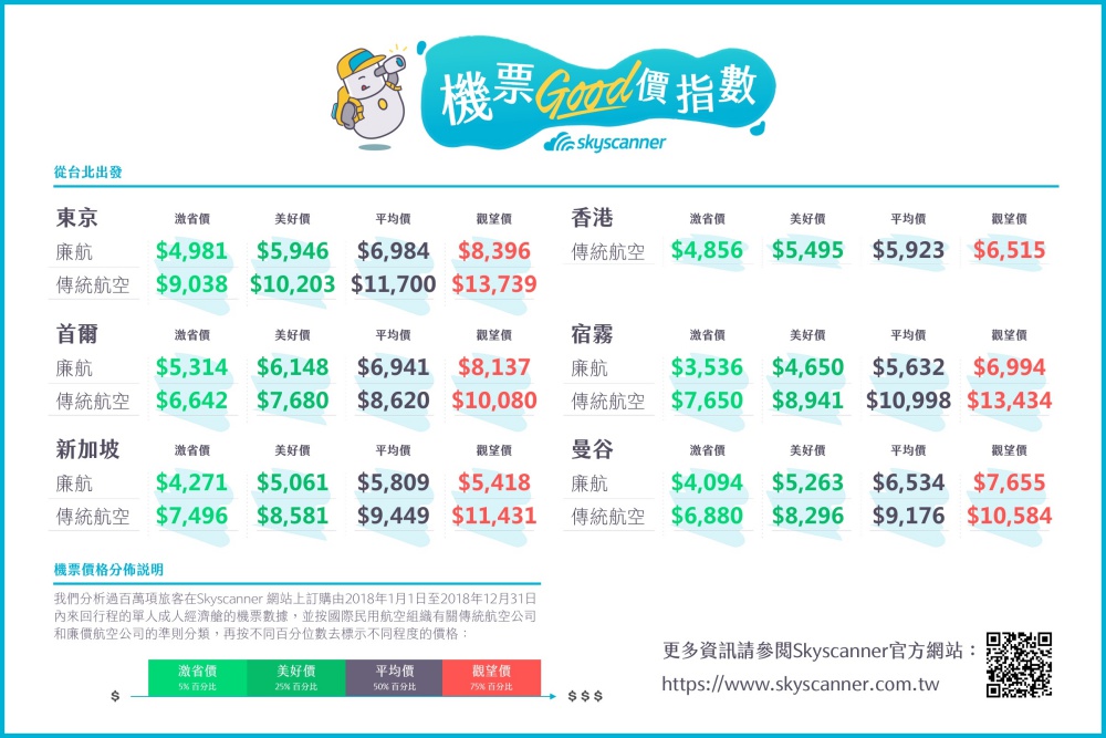 旅遊新手常覺得機票價格讓人看得眼花撩亂,困惑到底多少錢的機票才值得出手?深怕自己錯過好價錢或買貴了。Skyscanner(www.Skyscanner.com.tw)日前推出「機票『Good』價指數」,整理出熱門旅遊目的地的票價資訊,供旅客作為參考依據,同時 Skyscanner 也在 Line 官方帳號上推出「低價機票訂閱」功能,只要在Line上設定好目的地及價格,Skyscanner就會每天替你找出符合需求的旅遊產品。