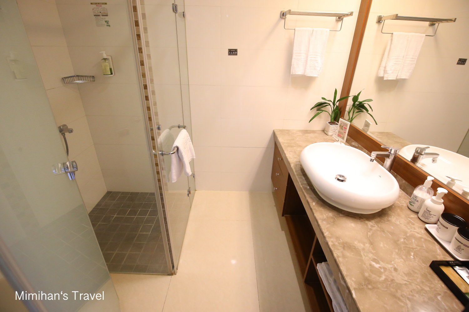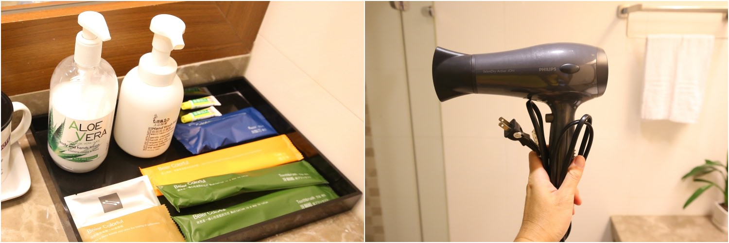 浴室乾濕分離,空間還蠻大的,各種備品當然也都齊全,有獨立式的吹風機。而且採用的是泡沫洗手乳、和義大利原裝進口天然費拉蘆薈乳液和Oliva橄欖洗髮沐浴精,洗劑這部分我也覺得用心。