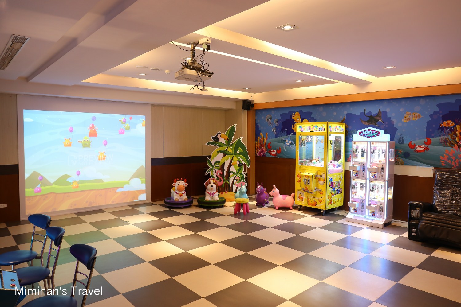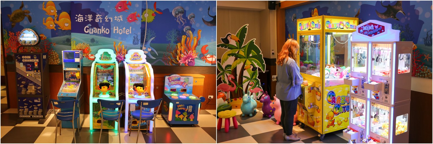 地下室的海洋奇幻城是冠閣大飯店的最新設施,裡面擺了好幾台適合小朋友的投幣式遊戲機台和玩具電動車,還有互動式投影機也是能讓小朋友盡情放電 😆