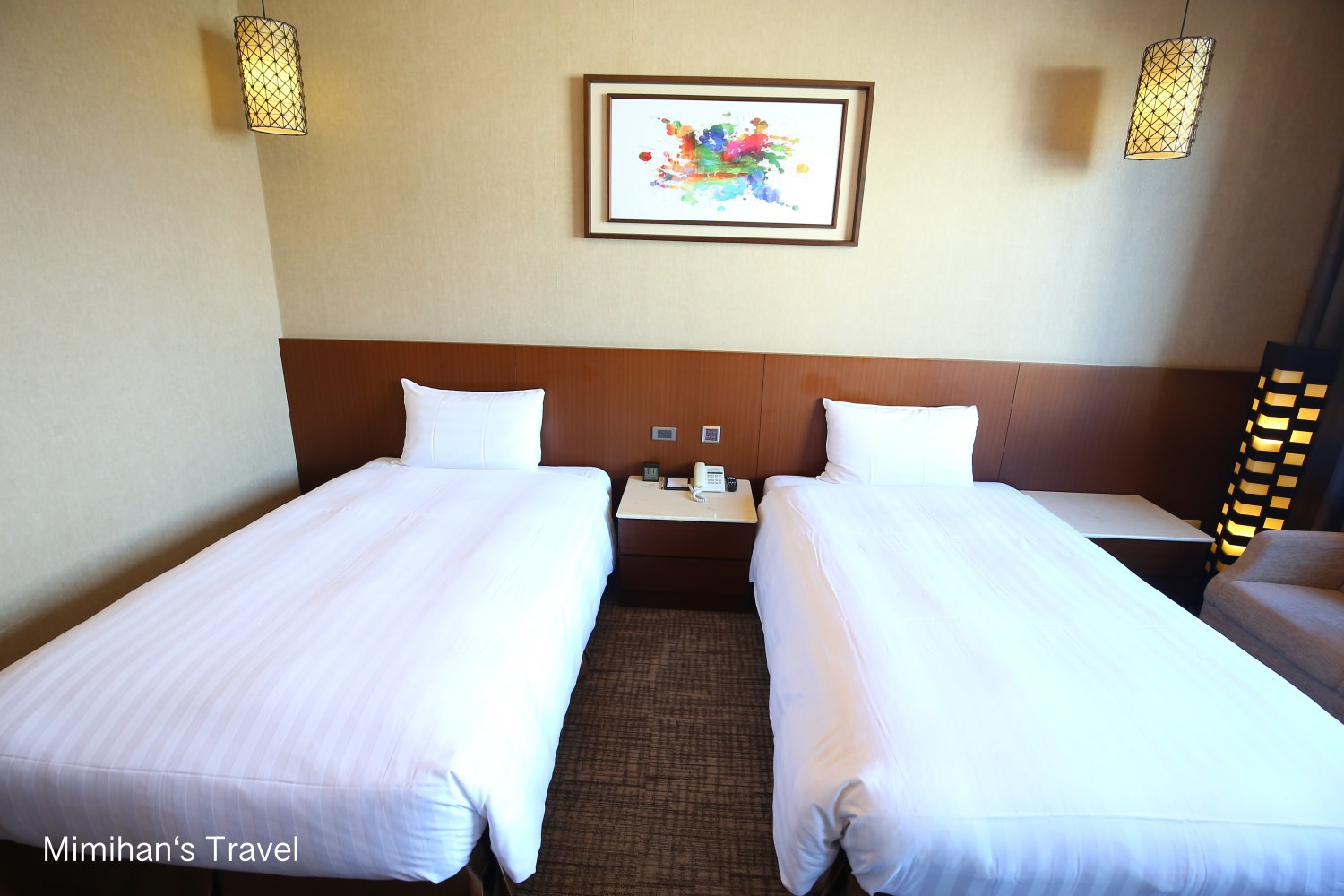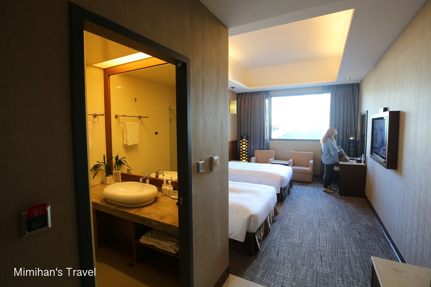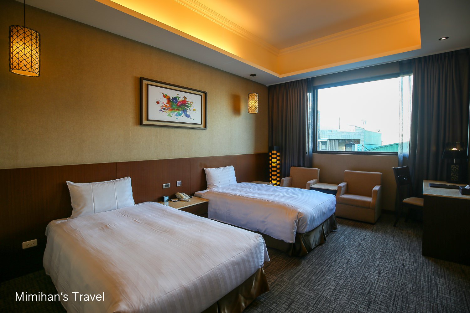 中間擺了兩張單人床,窗邊還有一組小沙發和茶几,且走道空間也足夠打開1~2個大行李箱,對比市區裡商務飯店的小空間來說,住在這裡舒服多了。