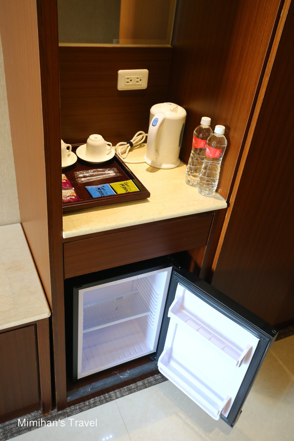 櫃子上有冰箱、快煮壺、簡單的咖啡茶包和兩瓶礦泉水,水不夠的話電梯旁有飲水機,而且飯店走出去2分鐘就有全家、7-11便利商店,附近也能找到50嵐、85度C等飲料店,很方便。