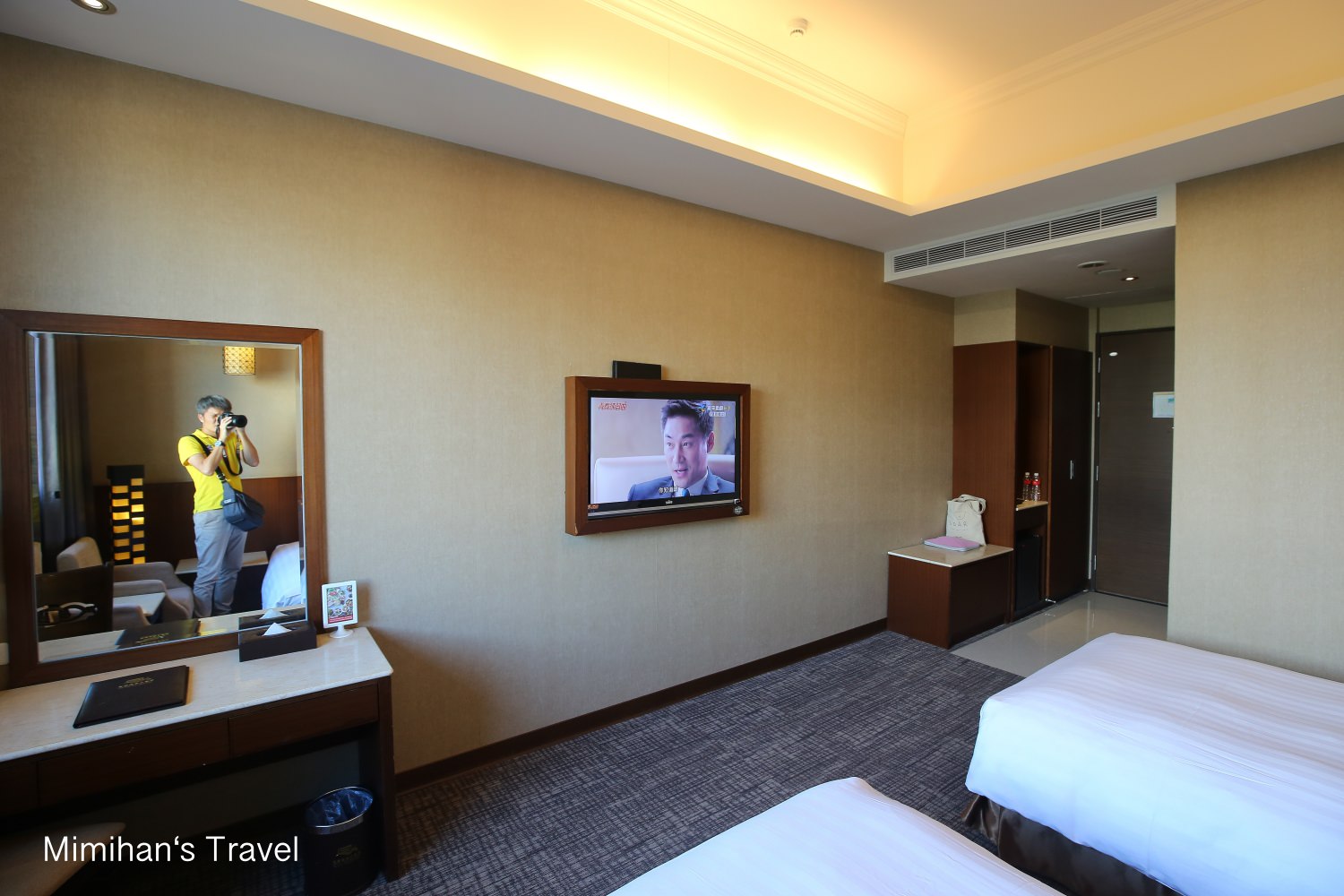 雙床房室內大概有9坪,門口進來右邊是衣櫥、Mini bar和行李架;左邊則是乾濕分離的浴室。而床鋪的位置鋪著地毯,整個感覺還寬敞乾淨且採光明亮,沒有奇怪的味道。