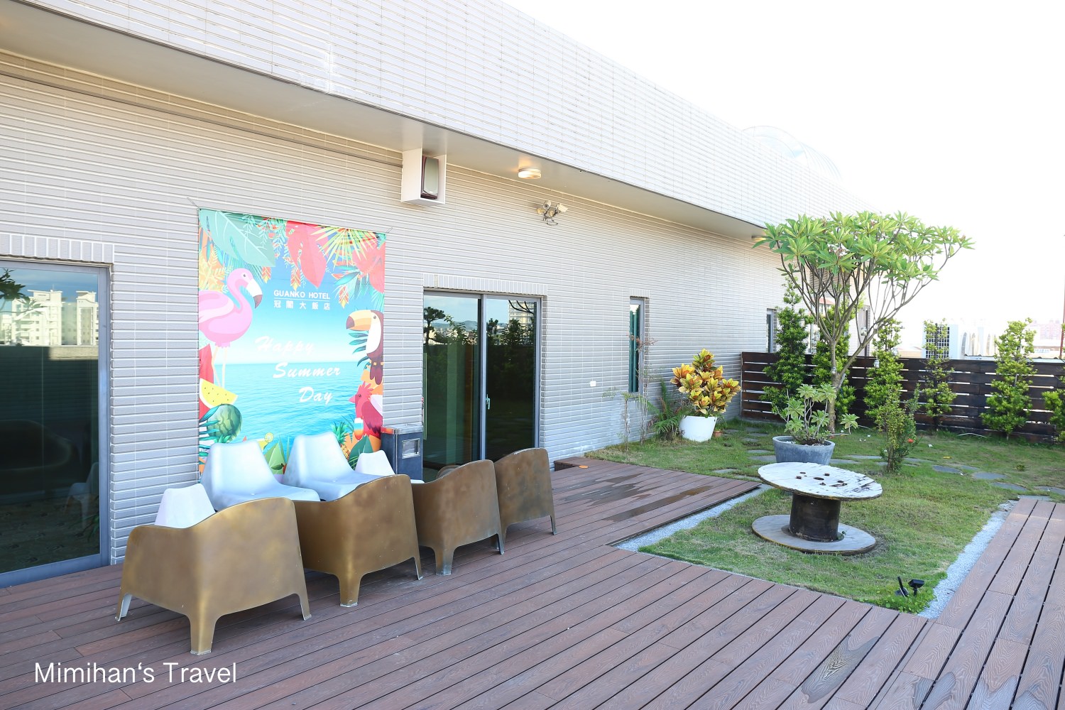 也可以上來飯店頂樓的空中花園,從這裡能遠眺嘉義地標景點-射日塔。不過這天來可能因為最近都有午後雷陣雨,桌椅暫時收起來惹~