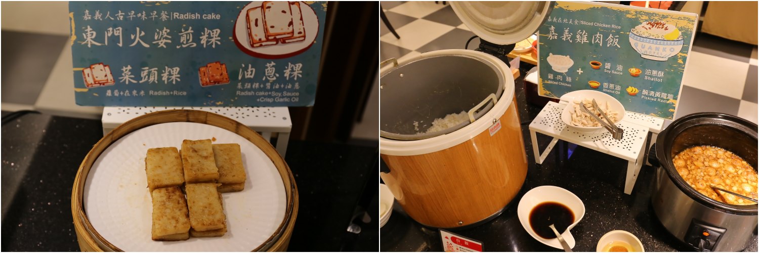 飯店早餐位於地下室的晨間家廚,是採用自助式供應,有中式和西式的餐點可以選,比較特別的是有像是嘉義涼麵、嘉義火雞肉飯、嘉義東門火婆煎粿⋯等更貼近在地的古早味餐點,如果是來洽公沒時間到處吃美食小吃的話,在飯店品嘗看看也是挺好。
