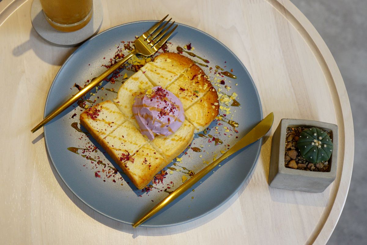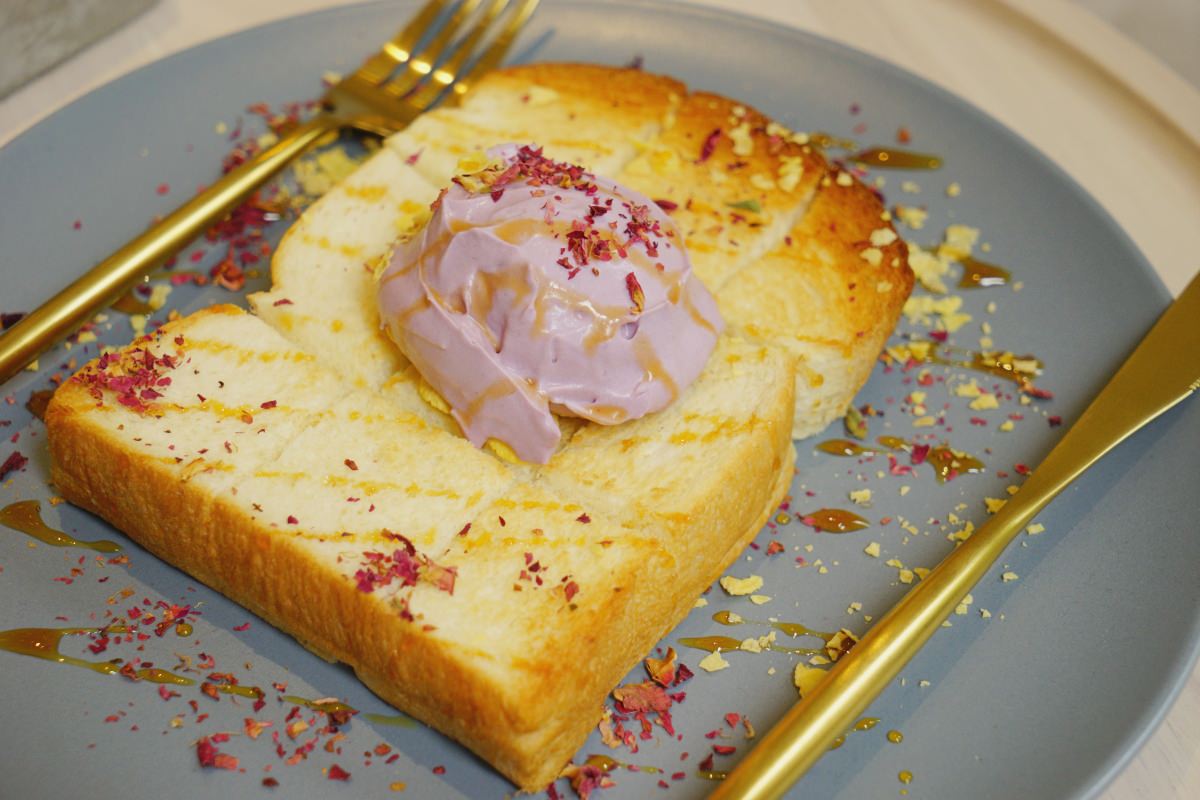 熱烤過的吐司,淋上蜂蜜,放上店家自製的紫薯鮮奶油,四周撒上玫瑰花瓣與玉米脆片,增添香氣與口感。紫薯本身是沒有味道的,店家打成鮮奶油,帶有微微的甜味與奶香,紫薯本身的香氣也隨之散發,口感綿密柔軟,配上香脆吐司,帶有層次的風味,喜歡!