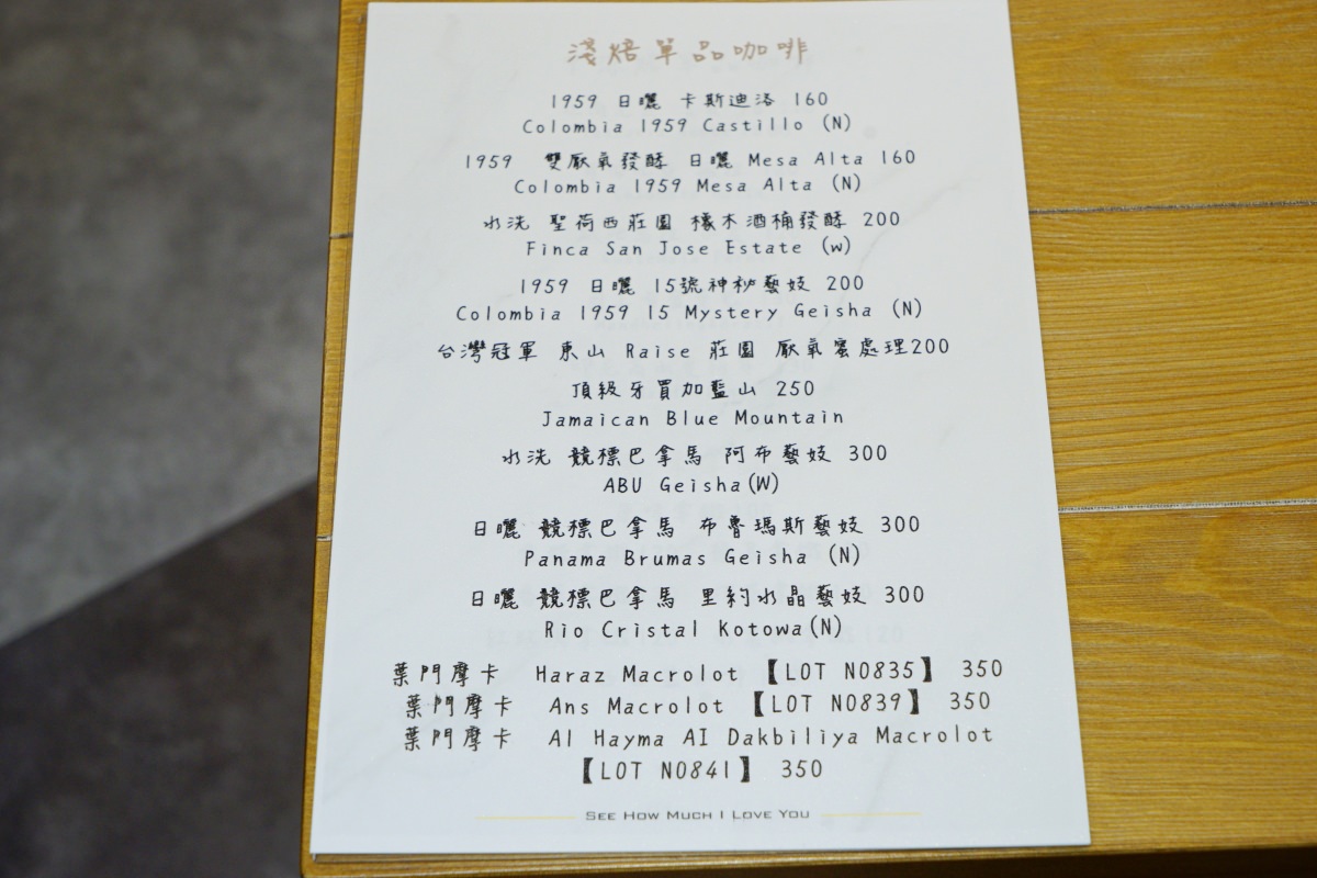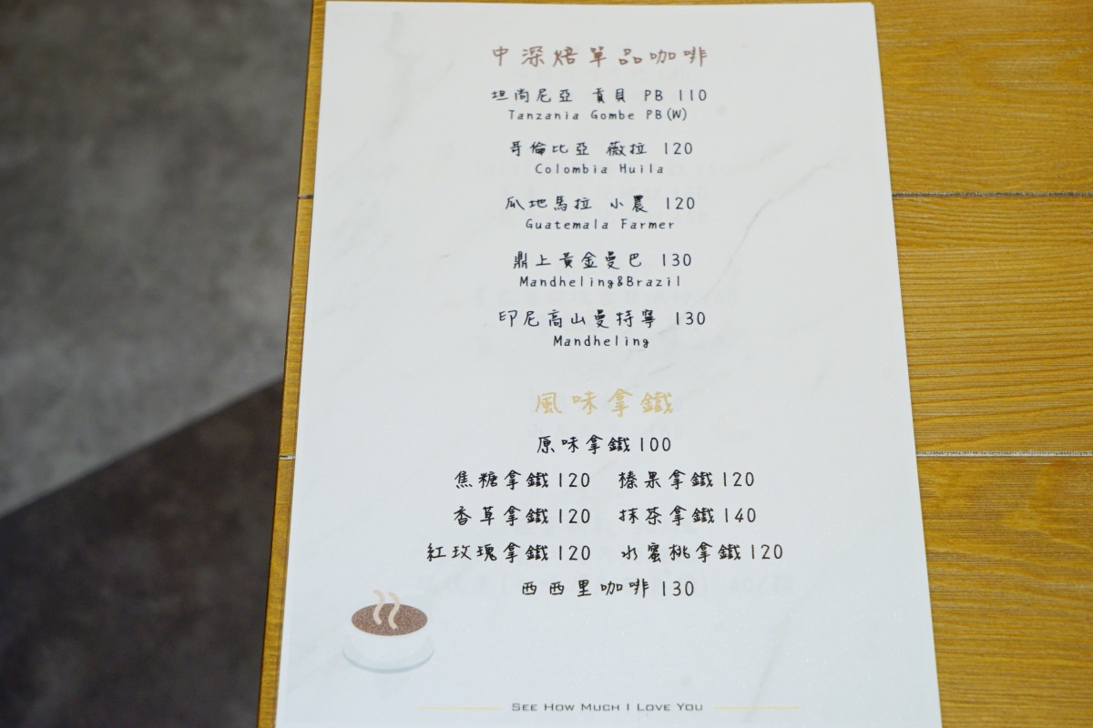 提供單品咖啡為主,另有義式咖啡、牛奶飲品、氣泡飲、冰沙,輕食部分有吐司、手工餅乾、瑪德蓮。點心品項不多,主要讓大家搭配飲料當下午茶享用。